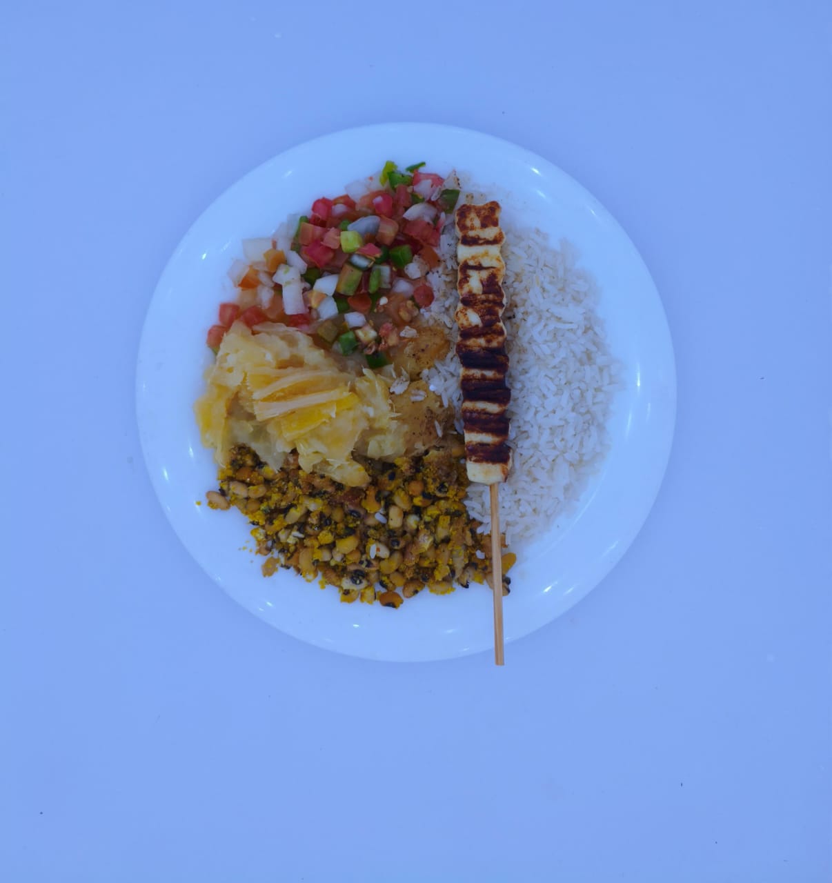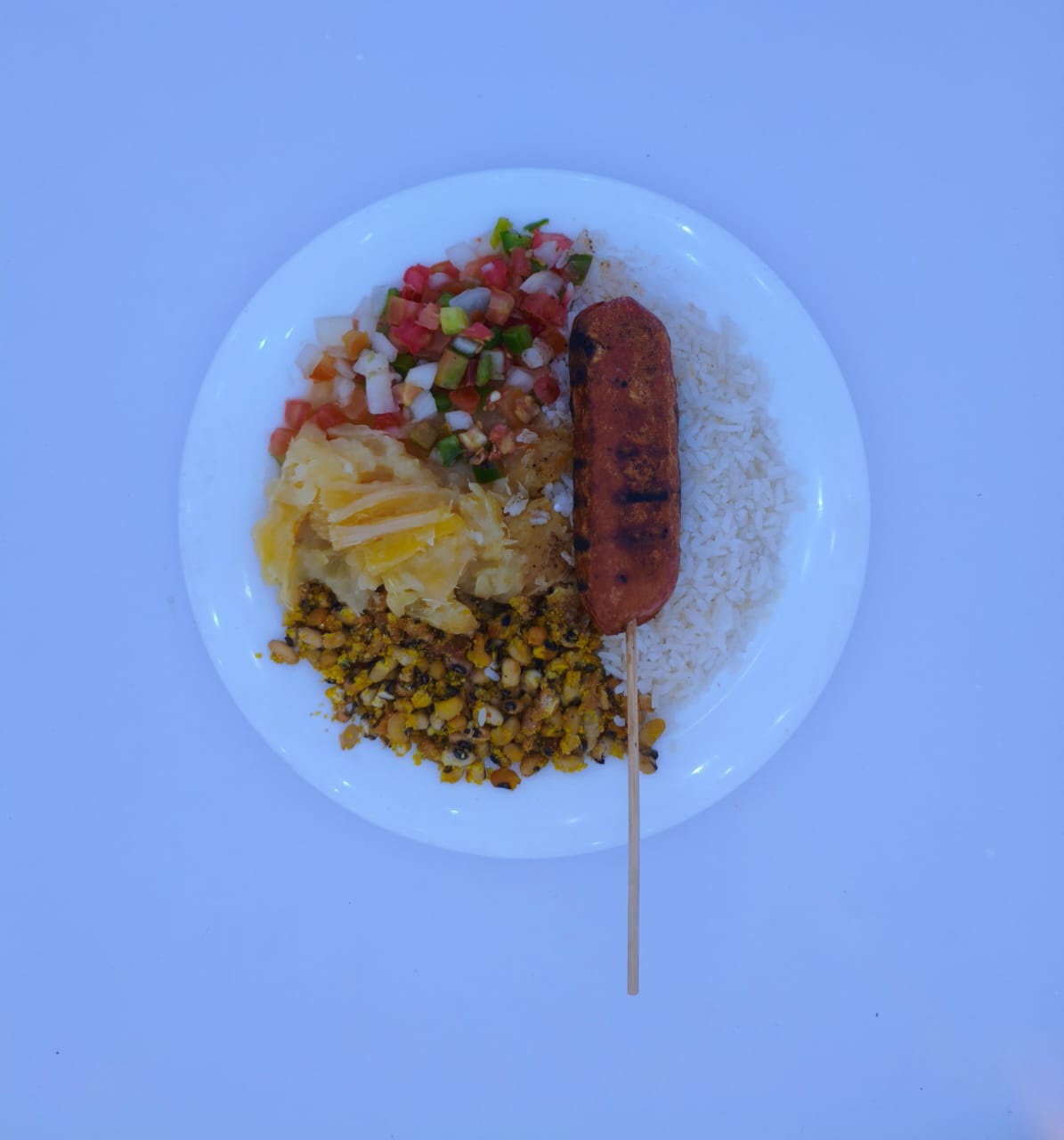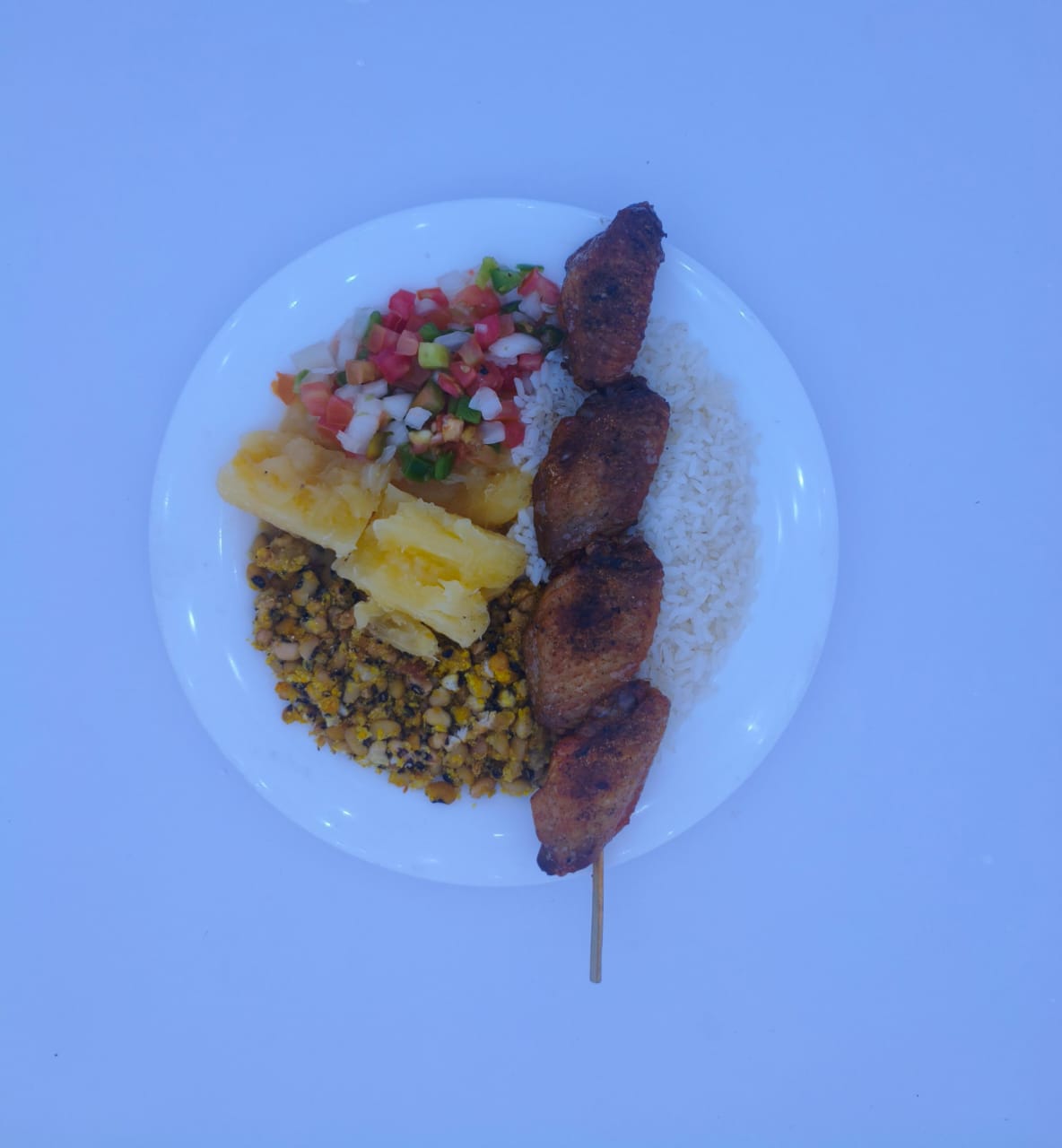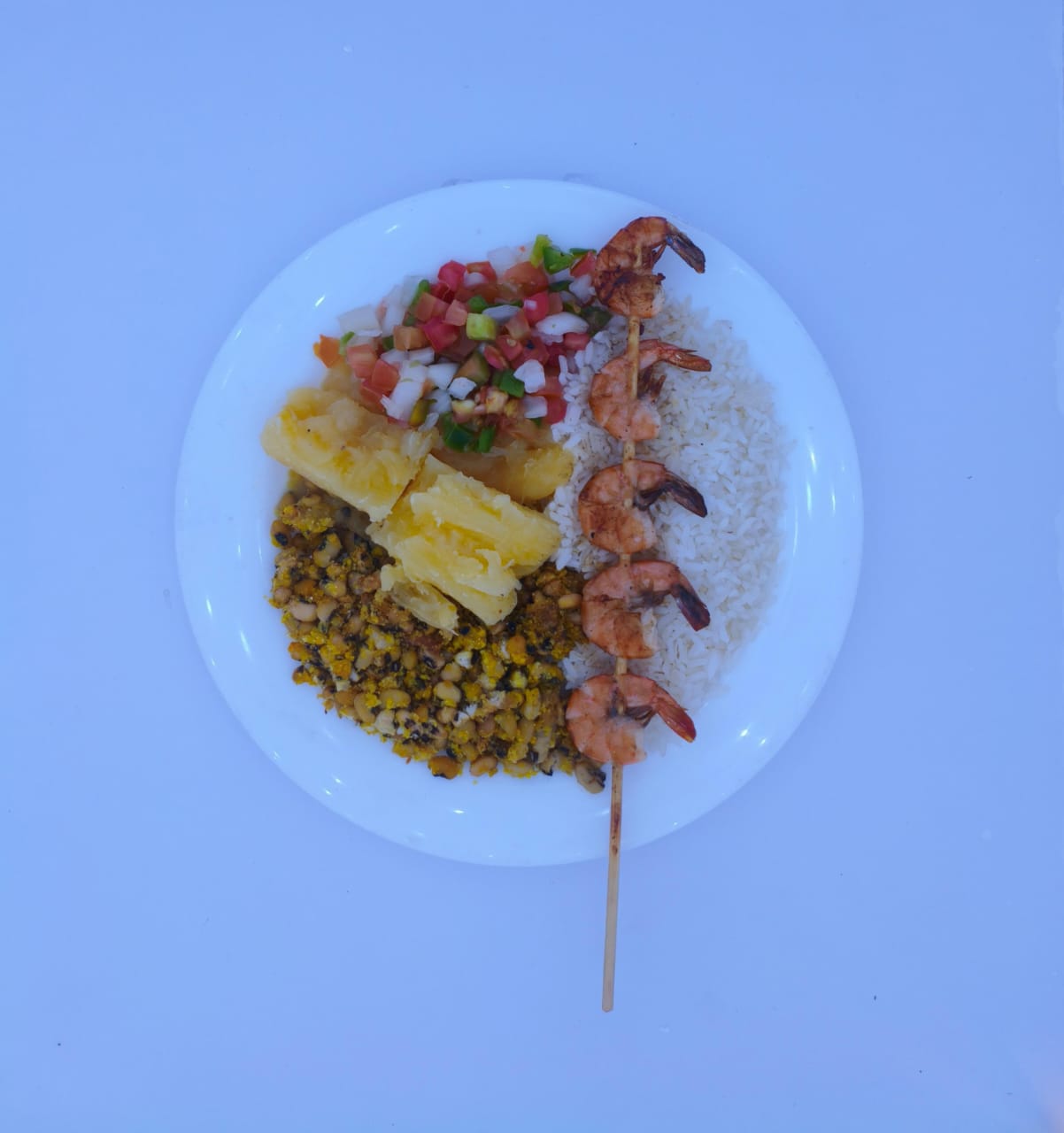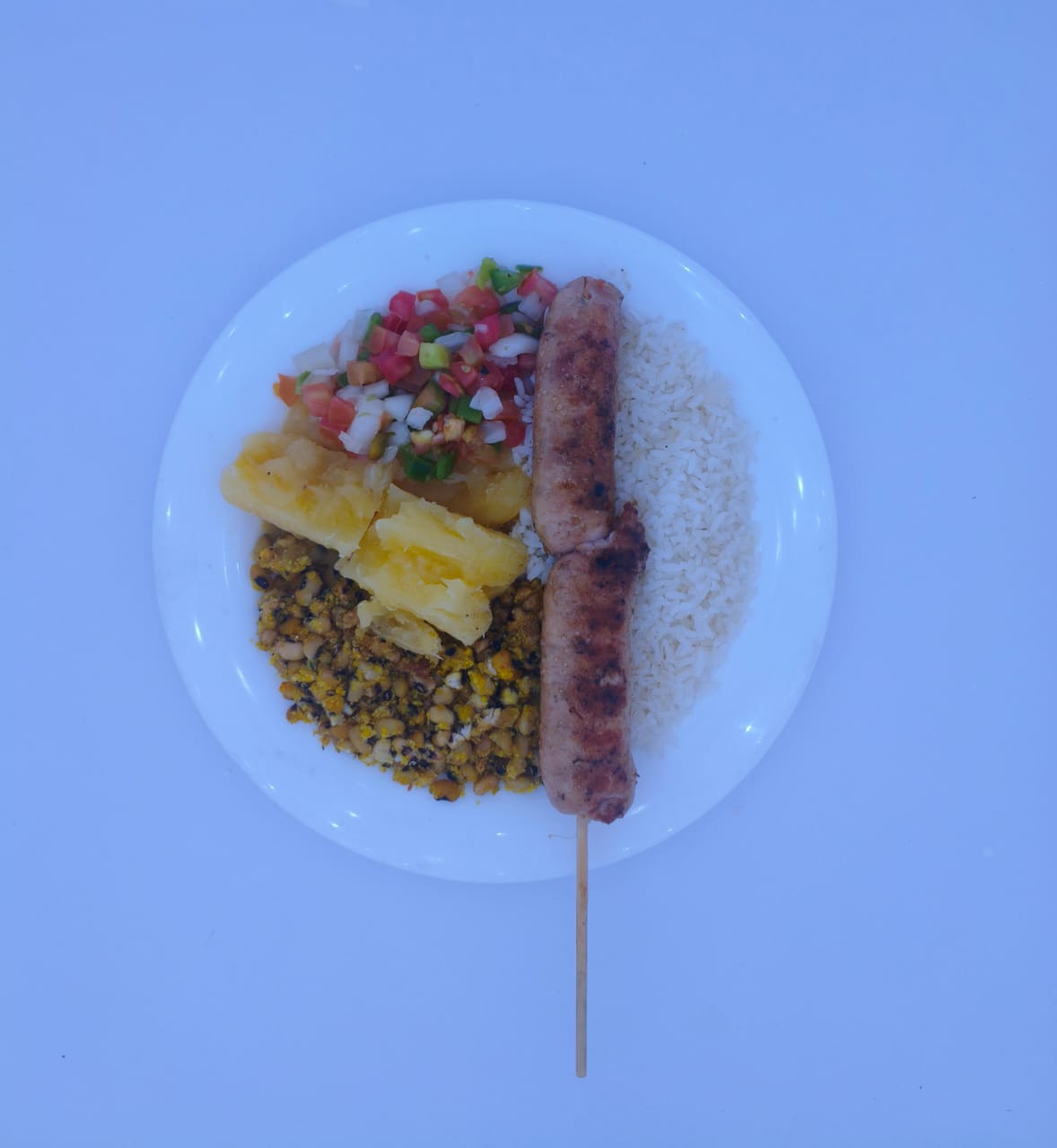 Arroz ,feijão tropeiro ou feijão de caldo , mandioca e vinagrete.