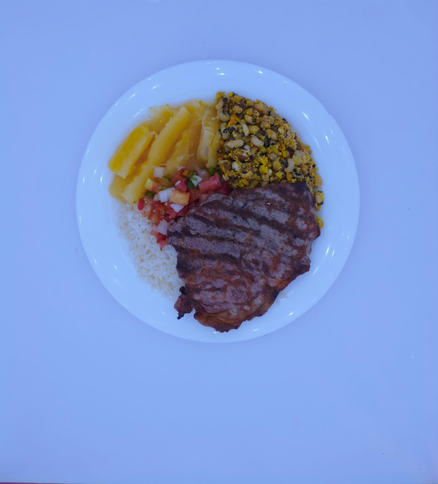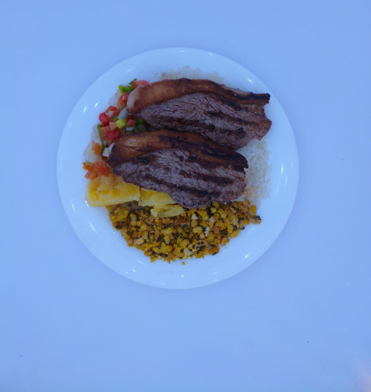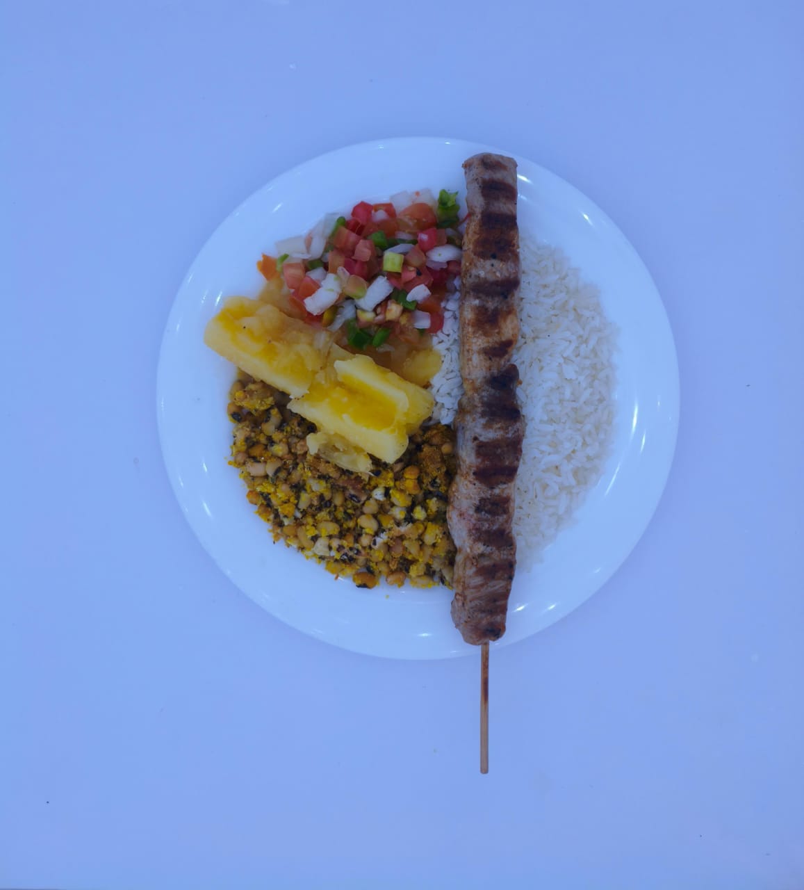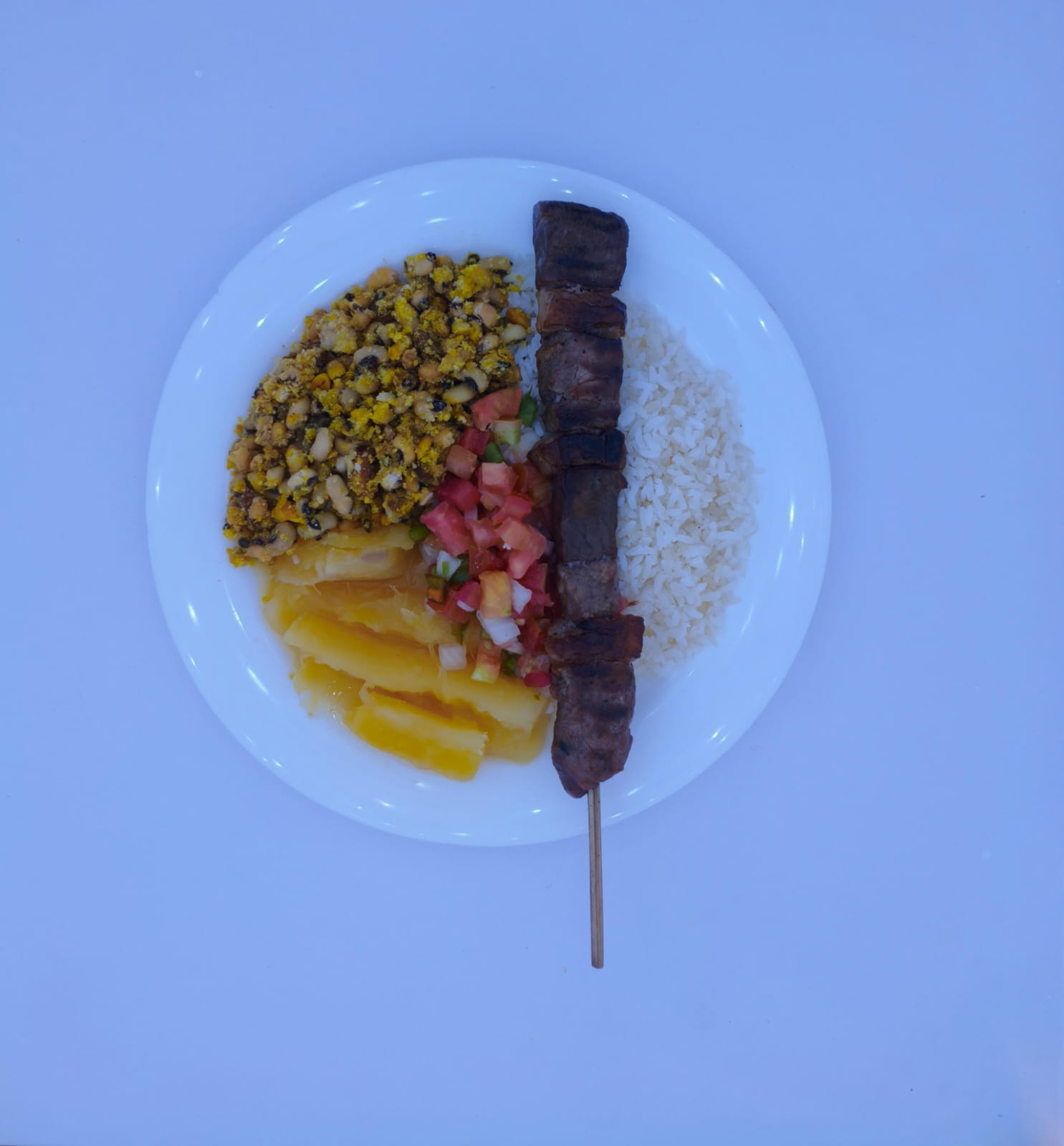 ACOMPANHAMENTOS: ARROZ, FEIJÃO TROPEIRO OU DE CALDO, MANDIOCA E VINAGRETE
